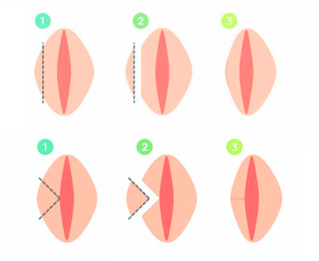 - удаление избыточной длины половых губ в размеченных пределах (скальпелем или лазером);