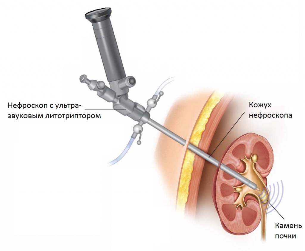 Операцию выполняют под общей или спинномозговой анестезией. Хирург прокалывает кожу, создаёт доступ к чашечке и расширяет канала специальным инструментом. Затем вводит в почку нефроскоп. Почечные конкременты дробят лазерной, ультразвуковой или электрогидравлической энергией. Затем осуществляют литоэкстракцию (удаление фрагментов камней).