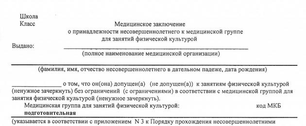 До начала учебного года учащимся школ, студентам вузов нужна справка о группе здоровья. Её предоставляют учителю. Справка с указанием группы здоровья позволяет преподавателю определить физическую нагрузку ученика во время занятий физкультурой. Учащиеся, имеющие ограничения по состоянию здоровья, обучаются по специальной программе.